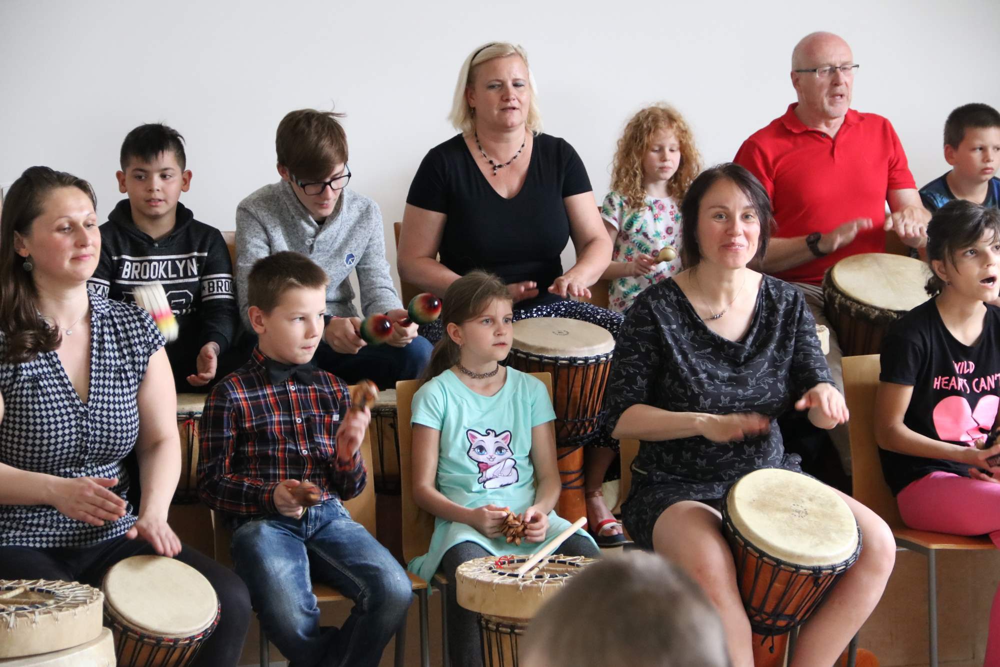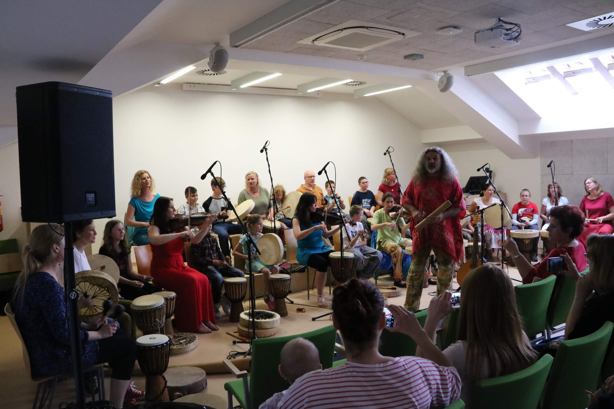 Zázraky světa – to je název muzikoterapeutického koncertu, který se ve čtvrtek 30. 5. 2019 uskutečnil v Knihovně Jiřího Mahena. Této neopakovatelné akce se zúčastnilo 14 žáků naší školy ze tříd (II., IV., VII., VII. A), které v průběhu celého školního roku pravidelně navštěvovaly lekce muzikoterapie. Početný orchestr dětí, jenž byl obohacen o muzikoterapeuty, pedagogy i zaměstnace KJM řídil PaedDr. Lubomír Holzer, (přední český muzikoterapeut), který svou nezměrnou energií dokázal během jediné generálky všechny ve zvuku spojit a vyladit. Všichni zúčastnění se svého úkolu zhostili s obrovským nadšením a nasazením, zároveň však s citlivým přístupem, proto není divu, že se celým sálem nesly velmi příjemné melodie. V rámci koncertu zazněly moravské lidové, slovanské i intuitivní písně v přirozeném ladění. Vystřídala se řada rozličných nástrojů: bubny djembé, šamanské rámové bubny, didgerdidoo, gongy, cistra, housle, flétny, brumle a chřestidla. Nálada v rámci koncertu byla velmi radostná až živelná. Vystoupení mělo úspěch, o kterém svědčil rozzářený sál diváků.